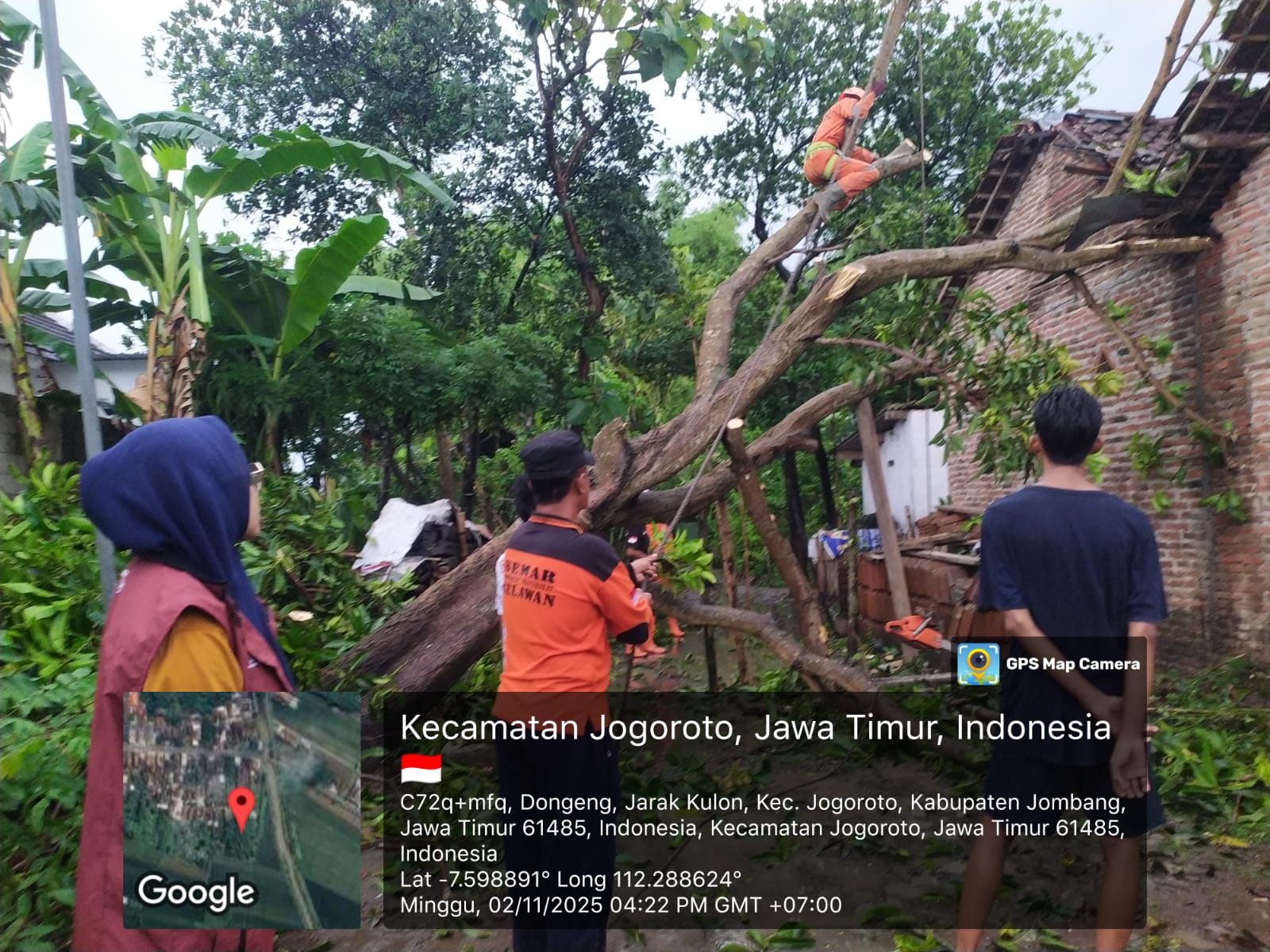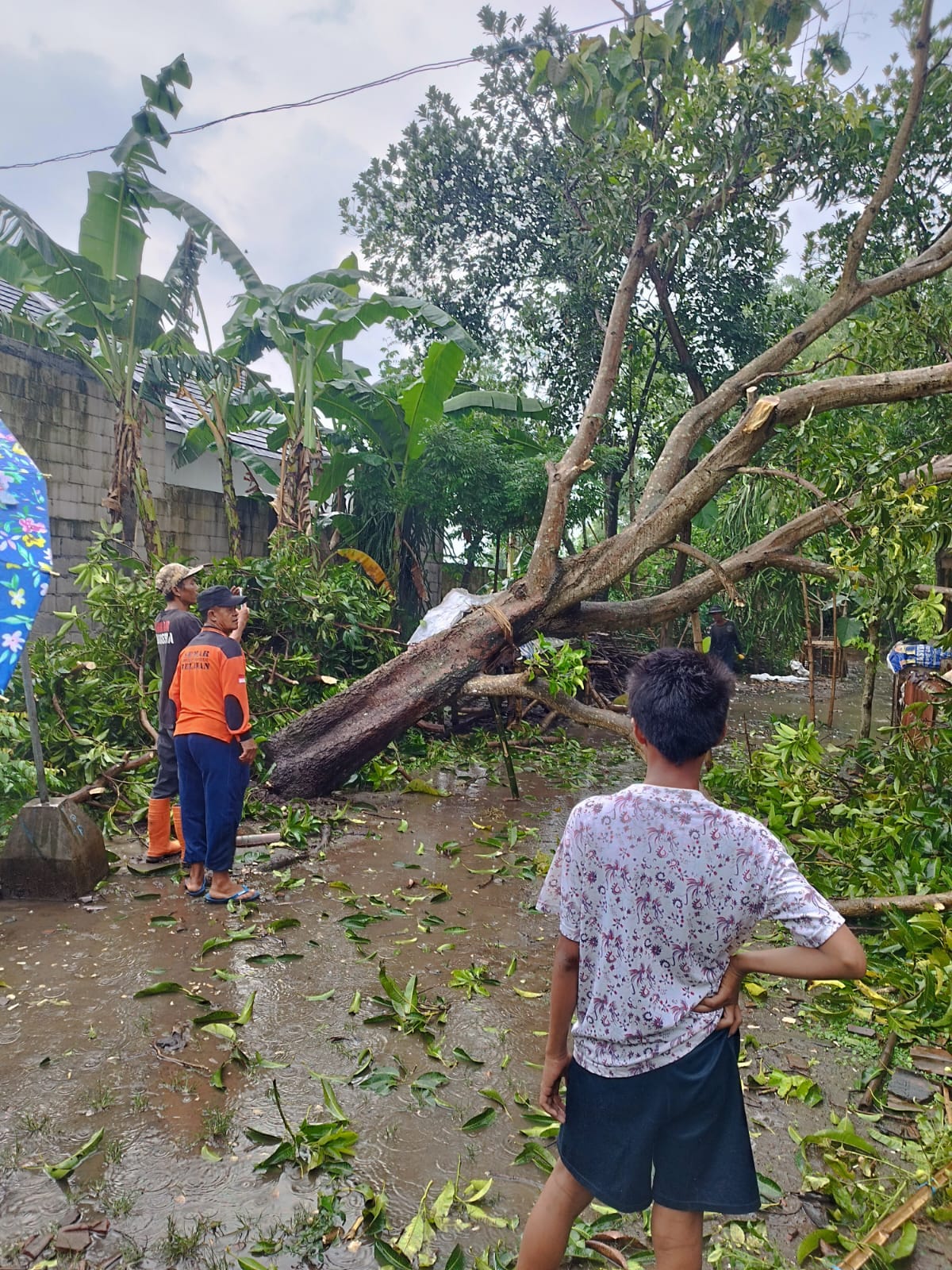 Pukul 14.30 WIB, BPBD dibantu Perangkat Desa, TNI, POLRI, Tagana, Relawan Semar, Senkom, Pendamping PKH melakukan penanganan bencana pohon tumbang dan melakukan mitigasi bencana, yaitu 1 KK 2 jiwa, mengenai ruang dapur dan tengah, genteng rusak, kuda kuda retak. Tembok dapur yang retak luasan kurang lebih 4 x 8 m. Tim selesai menangani pohon tumbang menjelang maghrib.