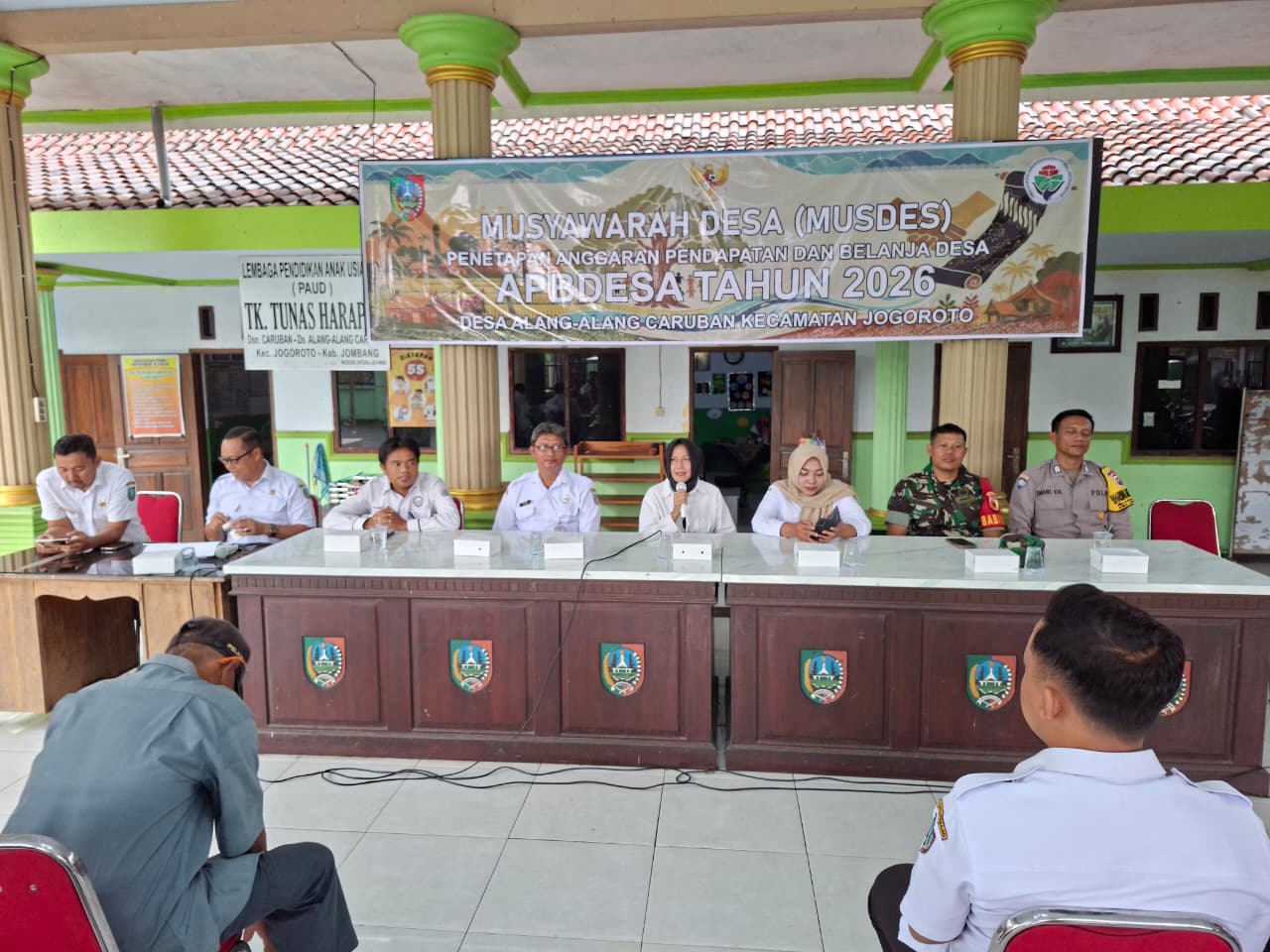 Pada hari Rabu, tanggal 27 Januari 2026, di Pendopo Desa Alang-Alang Caruban, mulai pukul 09.00 WIB s/d selesai, dilaksanakan Musdes Penetapan APBDesa Tahun 2026 Desa Alang-Alang Caruban. Yang mengundang Kepala Desa Alang-Alang Caruban, yang diundang BPD, Tokoh Masyarakat, Tokoh Perempuan. Dari Kecamatan yang diundang Camat, Kasi PMD dan Pendamping DD.
