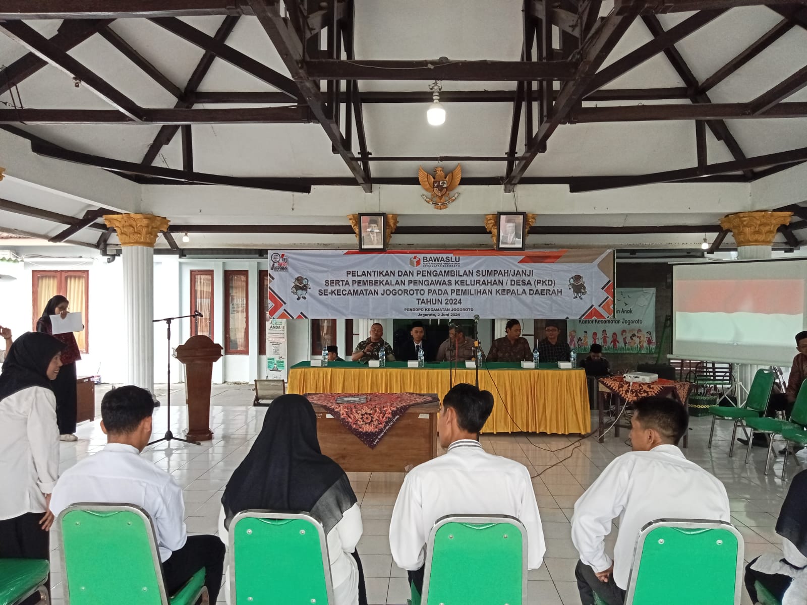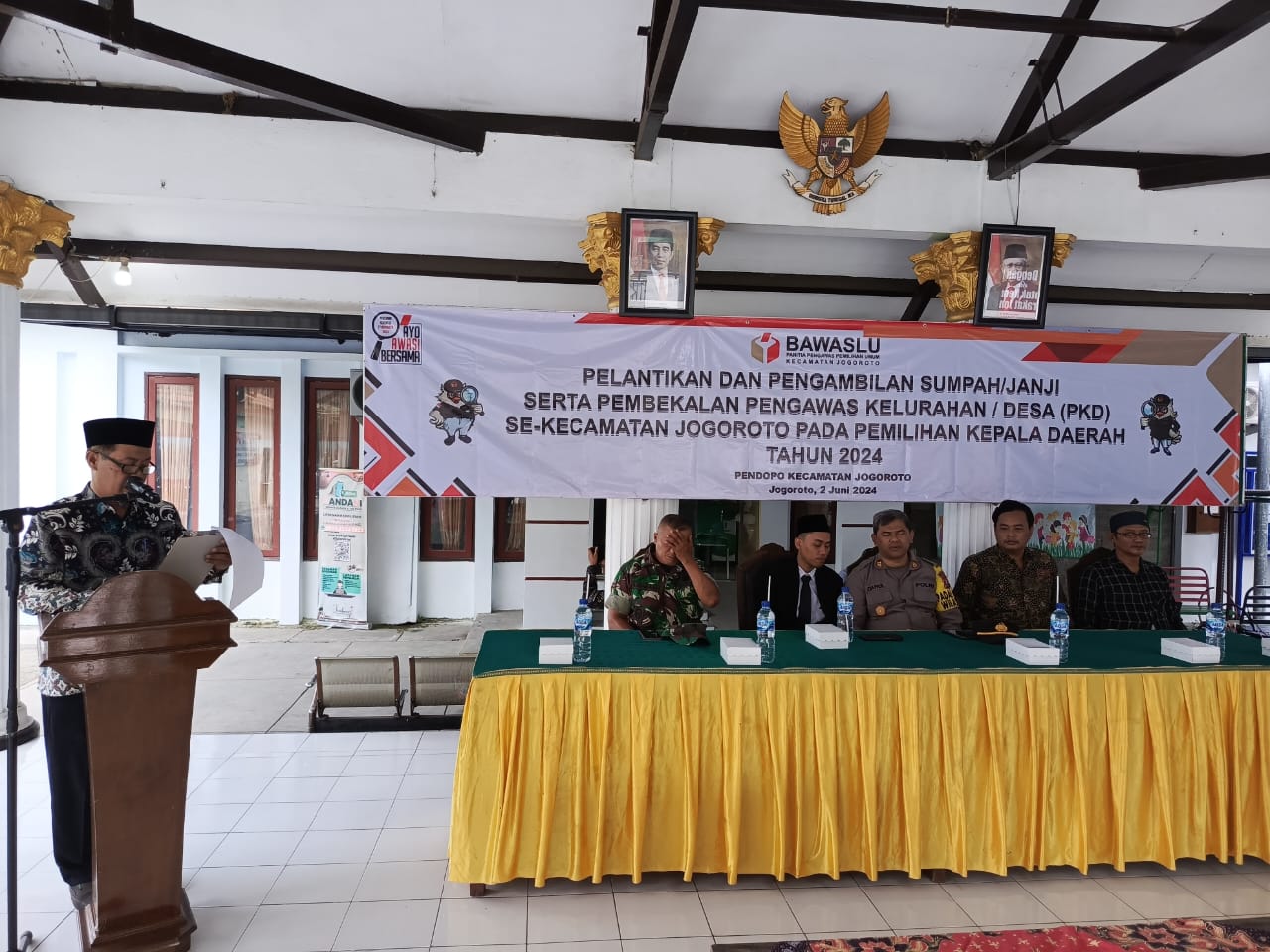 PELANTIKAN DAN PENGAMBILAN SUMPAH/JANJI SERTA PEMBEKALAN BAGI PENGAWAS KELURAHAN/DESA (PKD) PADA PEMILUKADA TAHUN 2024 SE KECAMATAN JOGOROTO DI PENDOPO KECAMATAN, 2 JUNI 2024