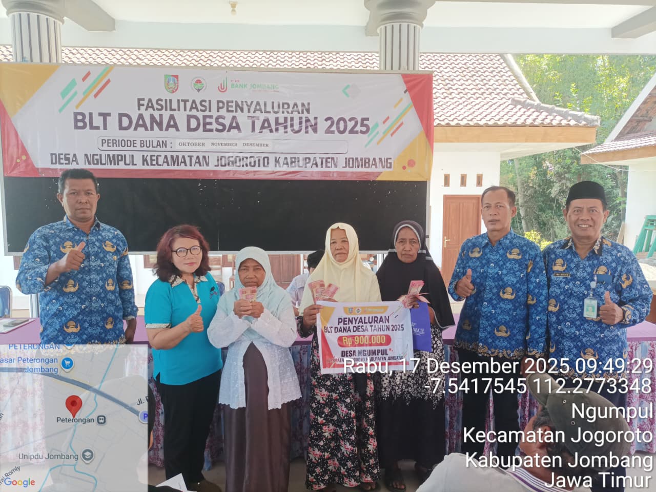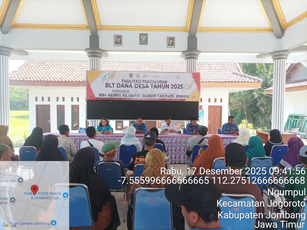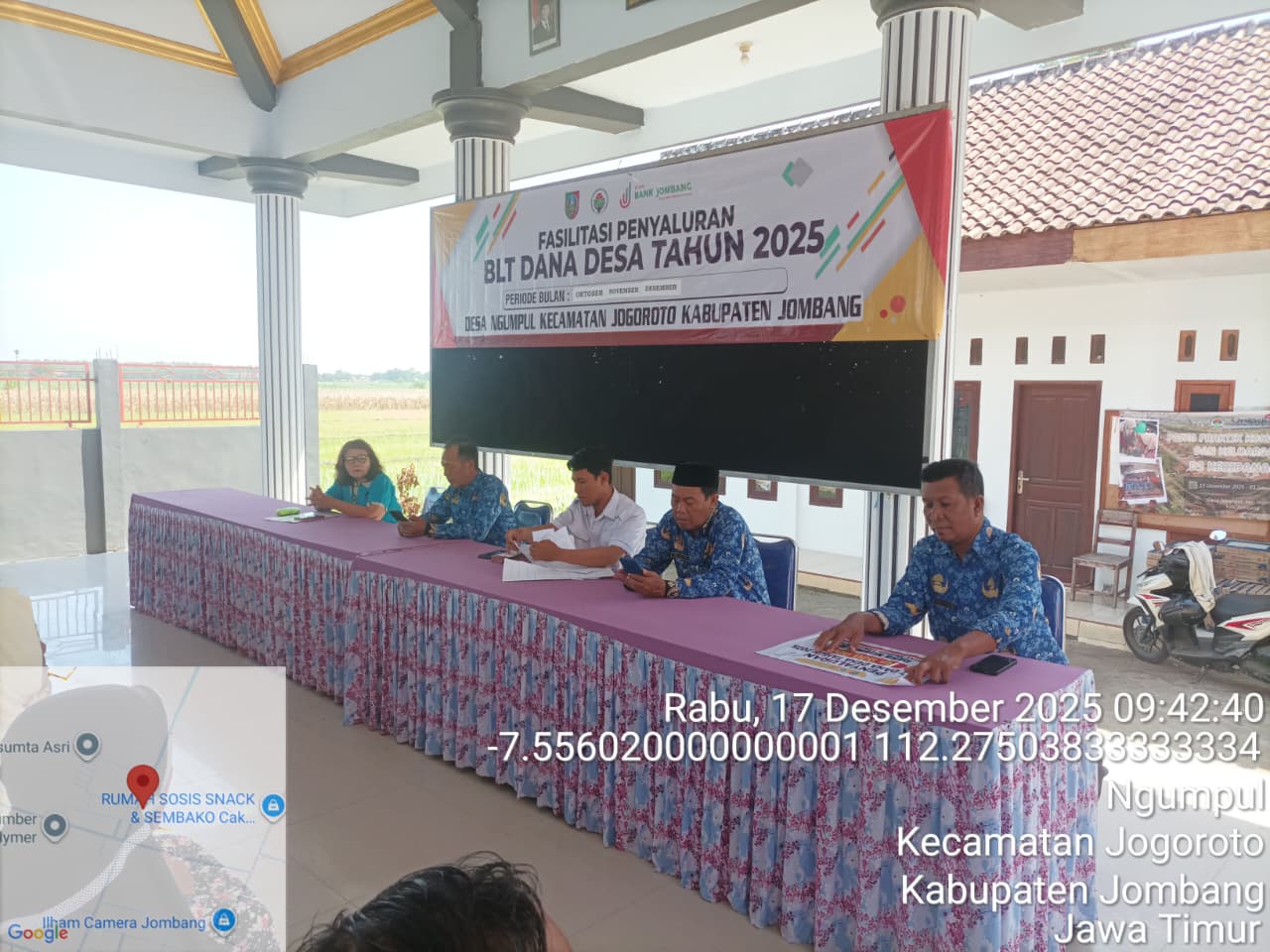 Pada hari Rabu, tanggal 17 Desember 2025, di Pendopo Desa Ngumpul, mulai pukul 09.00 s/d 10.00 WIB, dilaksanakan Penyaluran Penyaluran BLT DD Tahap IV Tahun 2025 Desa Ngumpul Kecamatan Jogoroto sebanyak 50 KPM. Pelaksana Petugas Bank Jombang, didampingi Petugas Kecamatan dan Pendamping Desa.