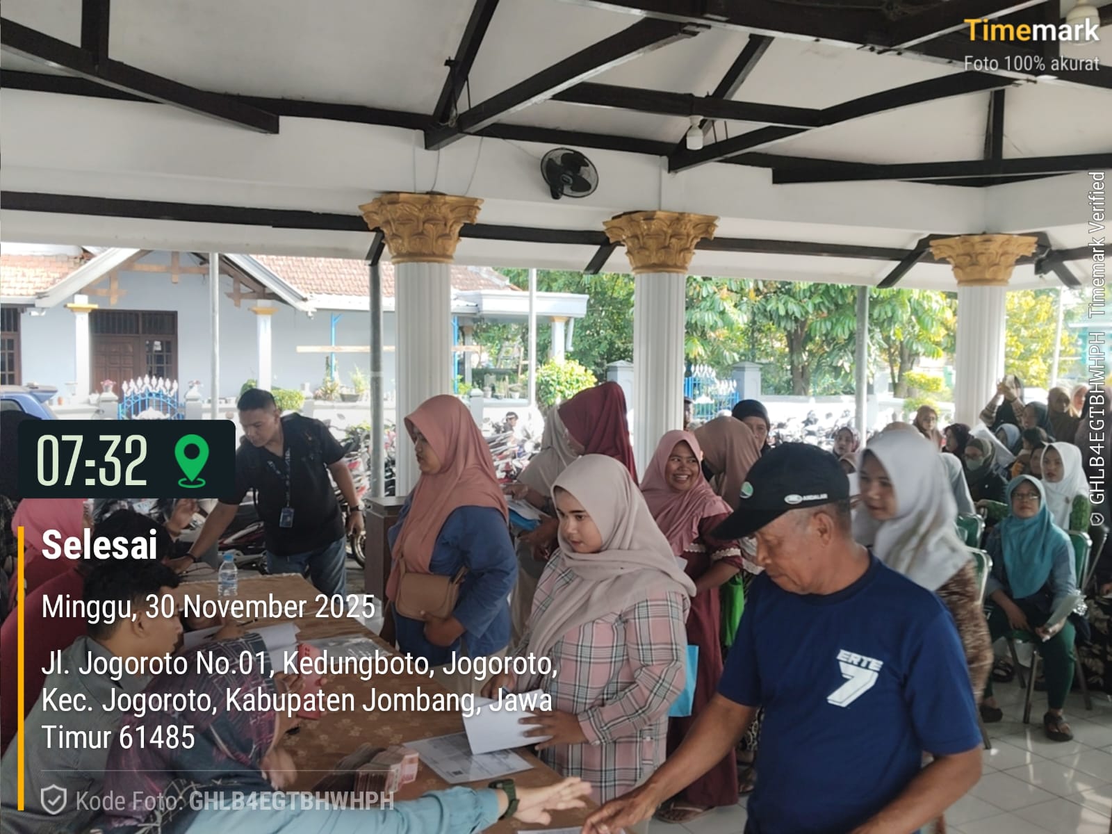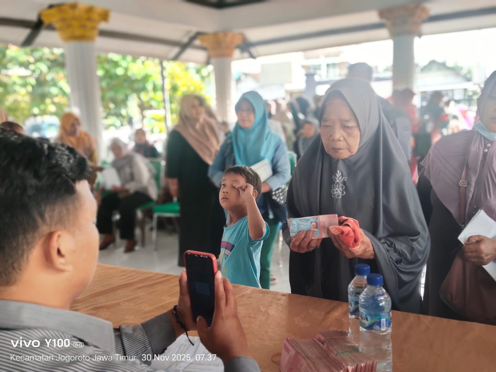 Pada hari Minggu, tanggal 30 November 2025, di Pendopo Kecamatan Jogoroto, mulai pukul 07.00 s/d 12.00 WIB, dilaksanakan Penyaluran BLT Kesra KPM Desa Ngumpul di Kecamatan Jogoroto sebanyak 717 KPM. Mulai pukul 13.00 s/d 15.00 WIB dilaksanakan Penyaluran BLT Kesra KPM Desa Alang-Alang Caruban di Kecamatan Jogoroto sebanyak 372 KPM. Pelaksana Petugas Kantor Pos Jogoroto, didampingi Plt. Kasi Sosbud dan PKH Kecamatan Jogoroto.