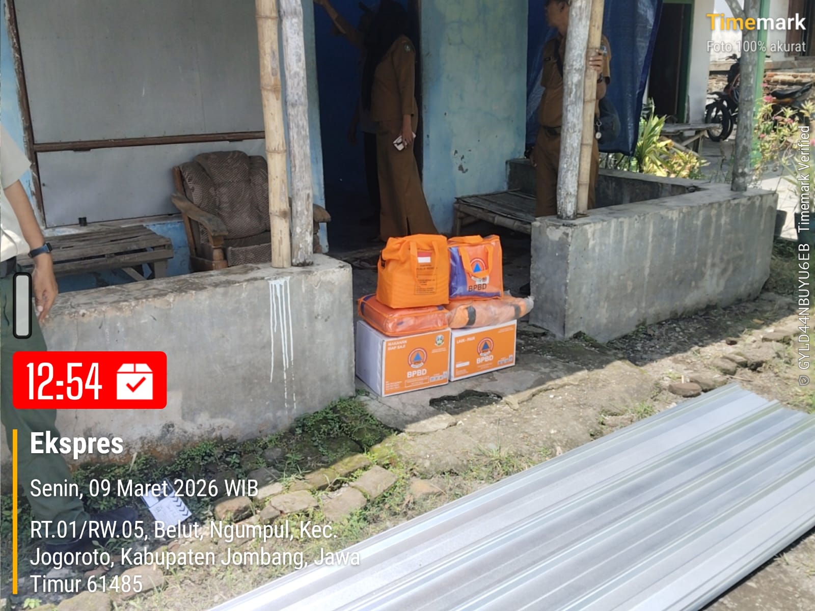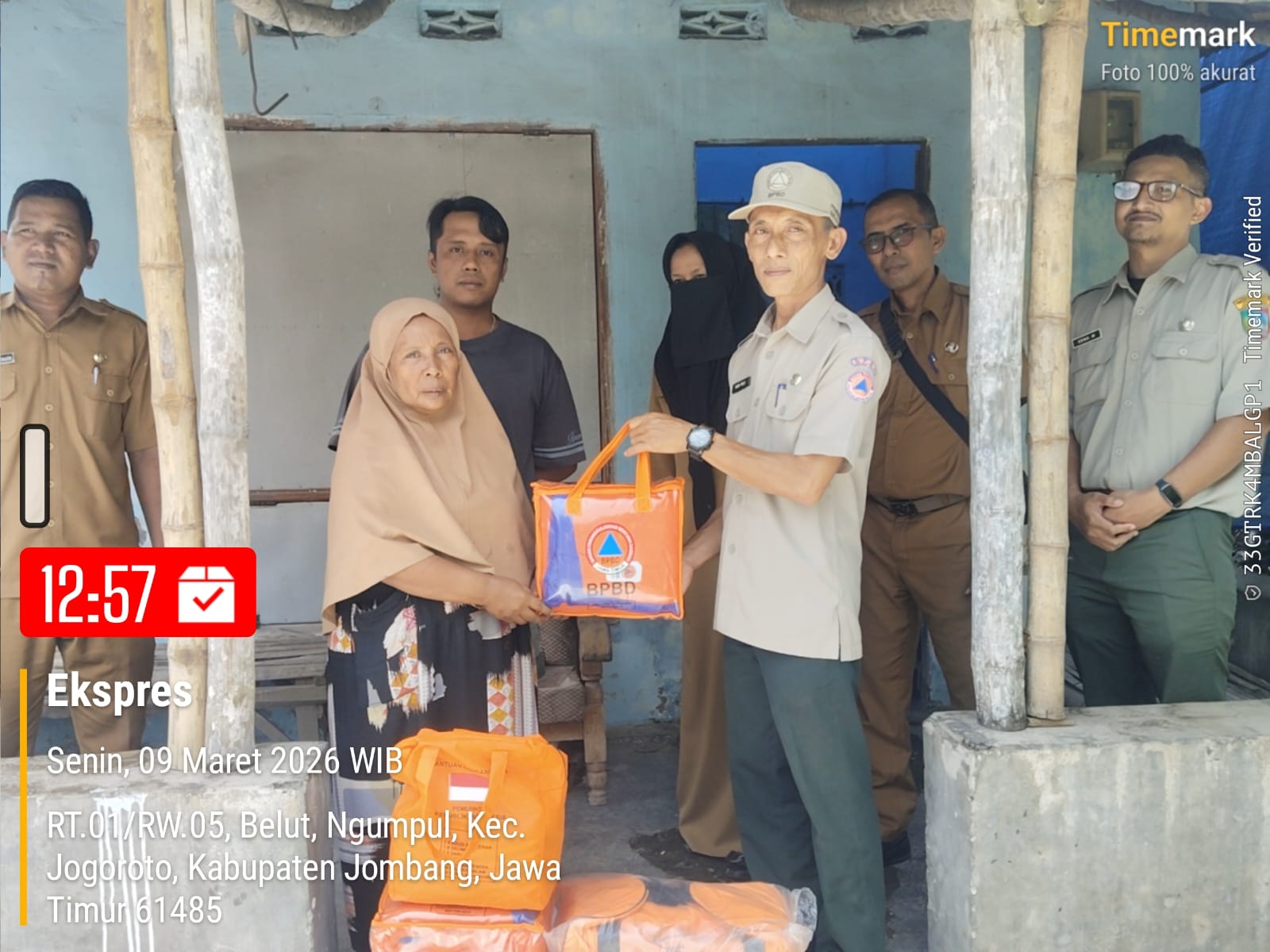 Pada hari Senin, tanggal 9 Maret 2026, di Dusun Belut Desa Ngumpul Kecamatan Jogoroto, mulai pukul 12.30 WIB s/d selesai, Camat Jogoroto menghadiri Penyerahan Bantuan Korban Bencana Alam Angin Puting Beliung Dari BPBD Jombang Kepada Ibu Komariyah. Dari BPBD yang menyerahkan Sekretaris BPBD kepada Ibu Komariyah disaksikan oleh Sekretaris Desa Ngumpul dan Perangkat Desa. Ikut mendampingi Camat Jogoroto Kasi Trantib Kecamatan Jogoroto.