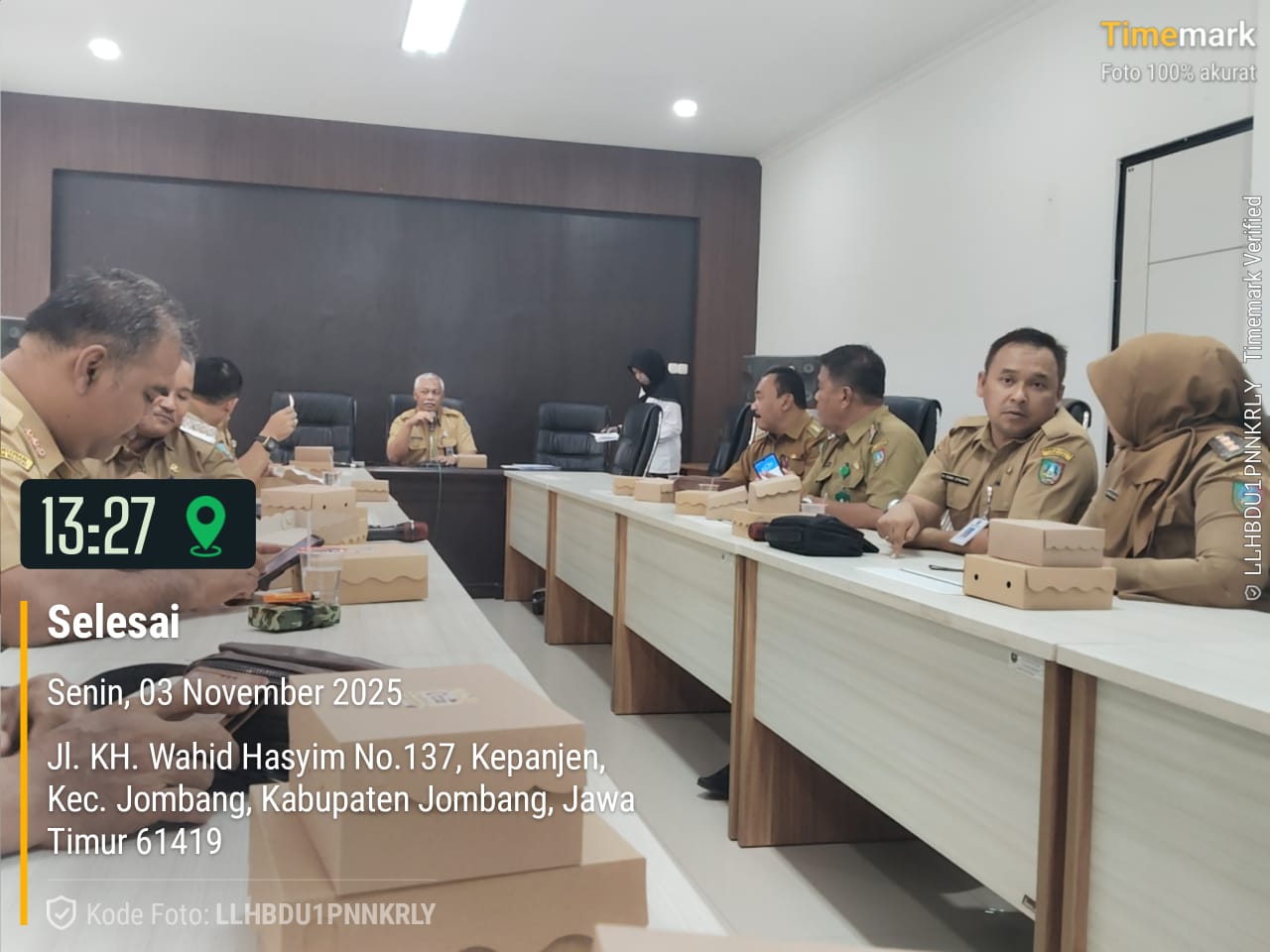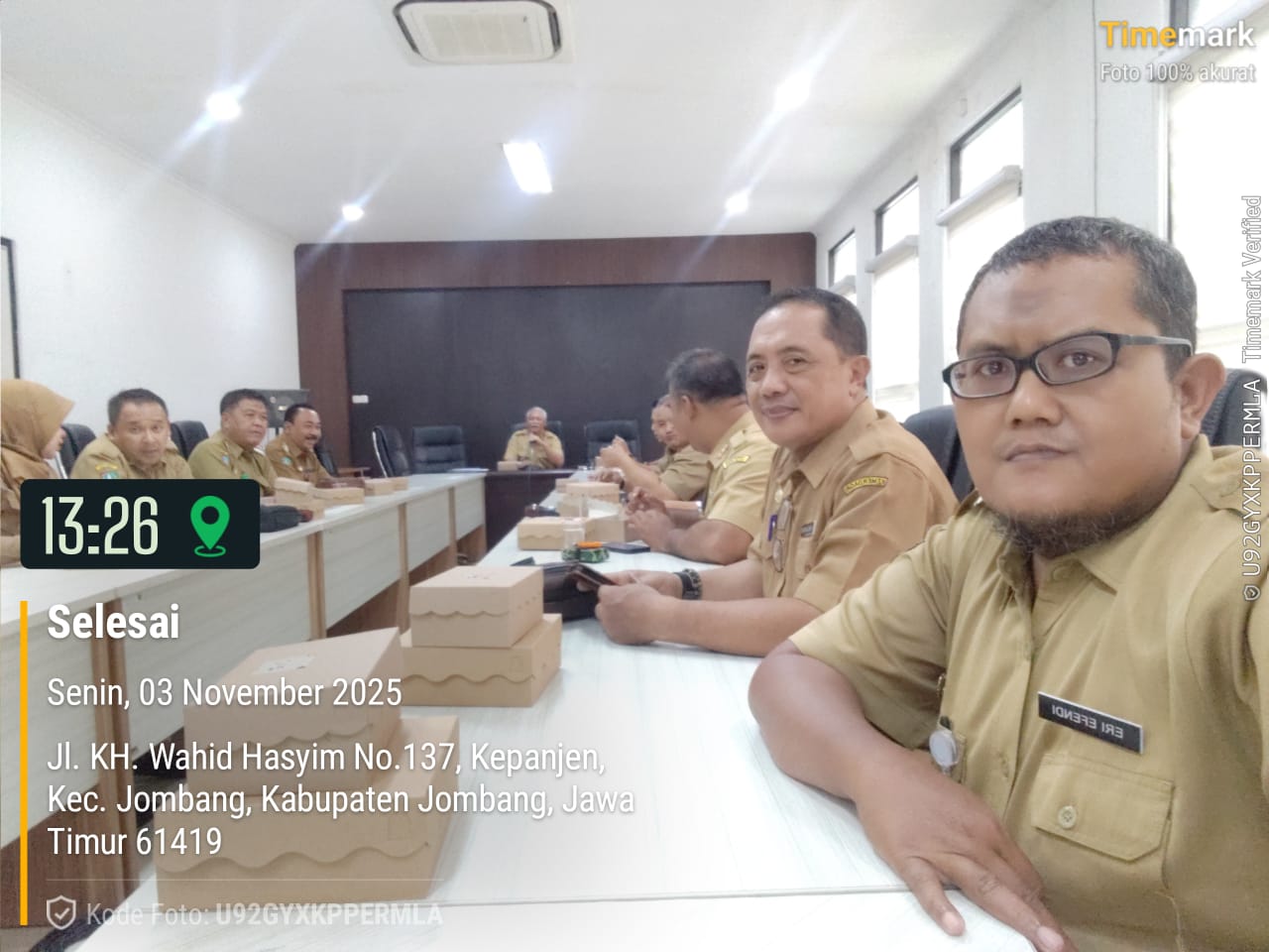 Pada hari Senin, tanggal 3 Nopember 2025, di Ruang Mostadjab Pemerintah Kabupaten Jombang, mulai pukul 12.30 WIB s/d selesai, Kasi Trantib menwakili Camat Jogoroto menghadiri Rakor Hasil Fasilitasi Rancangan Peraturan Bupati Tentang Pedoman Pelimpahan Kewenangan Bupati Kepada Camat. Yang mengundang Kepala Bagian Organisasi Kabupaten Jombang, yang diundang Camat se Kabupaten Jombang.