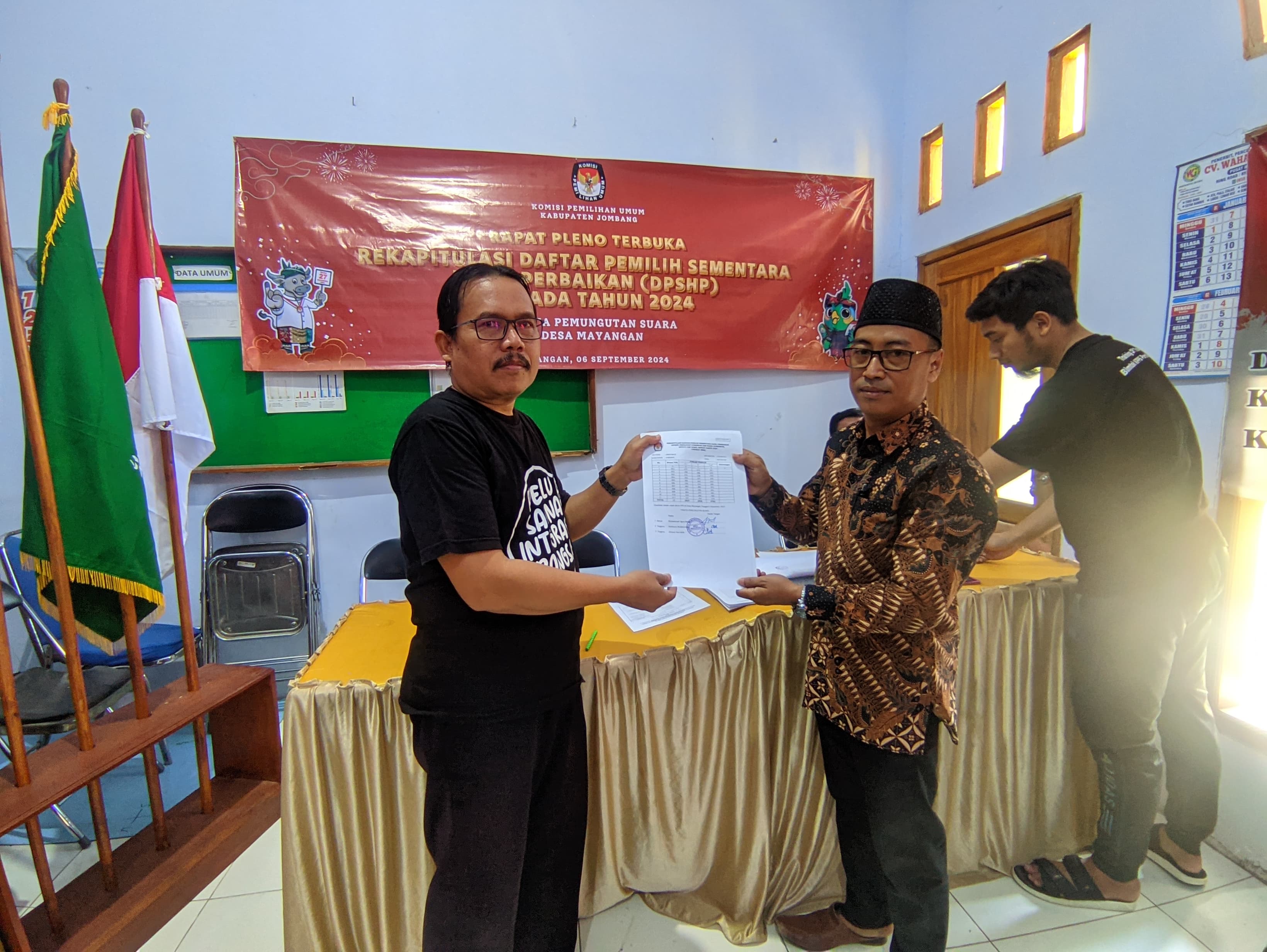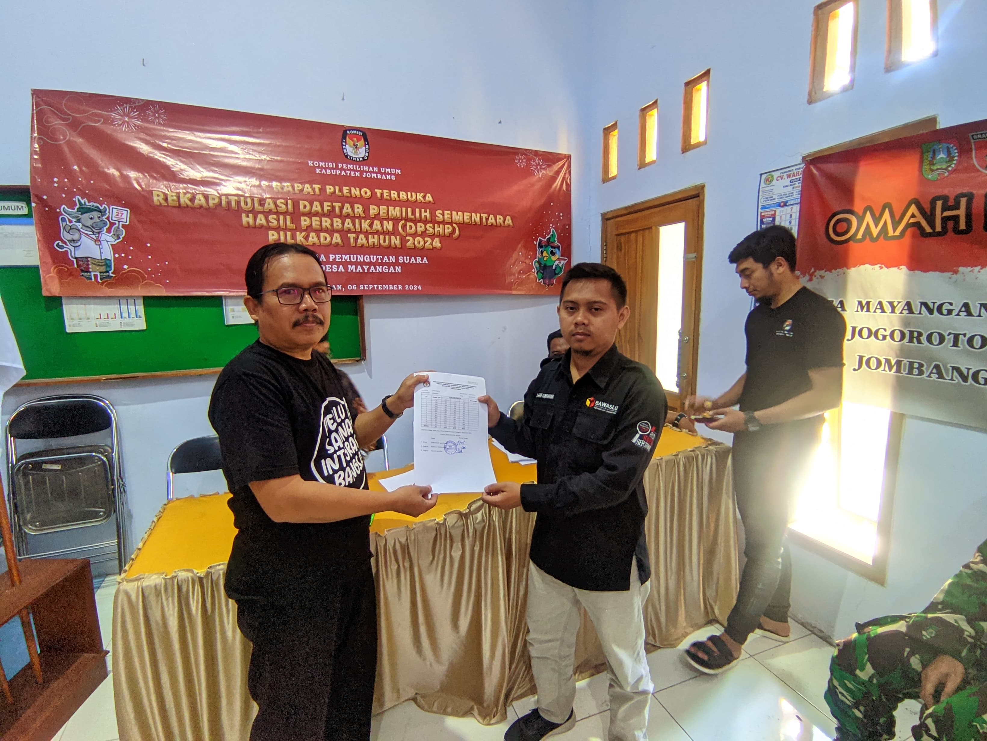Pada hari Jum’at, tanggal 6 September 2024, di Balai Desa Mayangan, mulai pukul 09.00 WIB s/d selesai, dilaksanakan Rapat Pleno Terbuka Rekapitulasi Daftar Pemilih Sementara Hasil Perbaikan (DPSHP) Pilkada Tahun 2024 Panitia Pemilihan Kecamatan (PPK/PPS) Kecamatan Jogoroto Desa Mayangan. Yang mengundang Ketua PPS Desa Mayangan. Ikut hadir PPK Jogoroto, PKD, Babinsa dan Babinkamtibmas Mayangan.